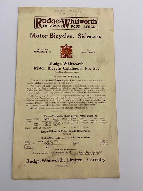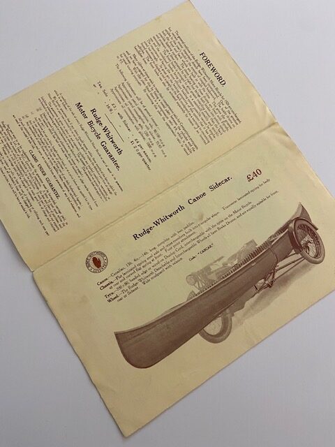Rare original Rudge-Whitworth leaflet, six page gatefold, featuring sales information and specifications on cream paper with b/w illustrations of 4.99-15BHP model with sidecar options including a ‘canoe sidecar with two paddles!