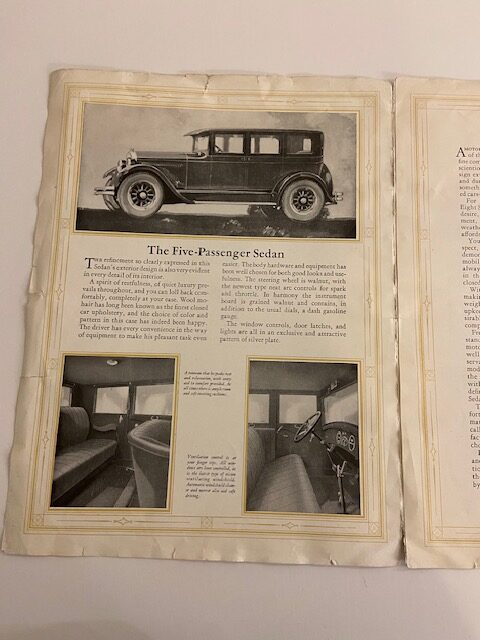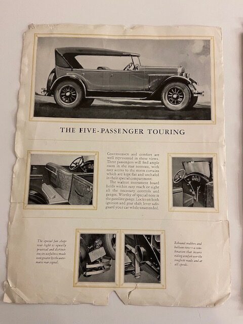 Two rare six page gatefold leaflets featuring the Hupmobile Eight touring car and Roadster and the Hupmobile Eight Series E Sedan and Coupe.